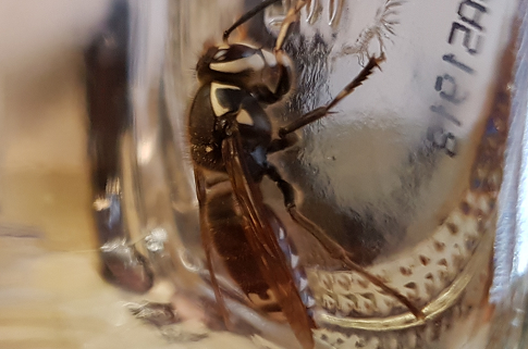 Number 6830. This is a bald-faced hornet, Dolichovespula maculata (Hymenoptera: Vespidae). Like most of its ilk, it can deliver a very painful sting, but in spite of its reputation for aggressiveness, I have never been stung by one, even when I have been quite close to a nest. Click here for more detailed information.