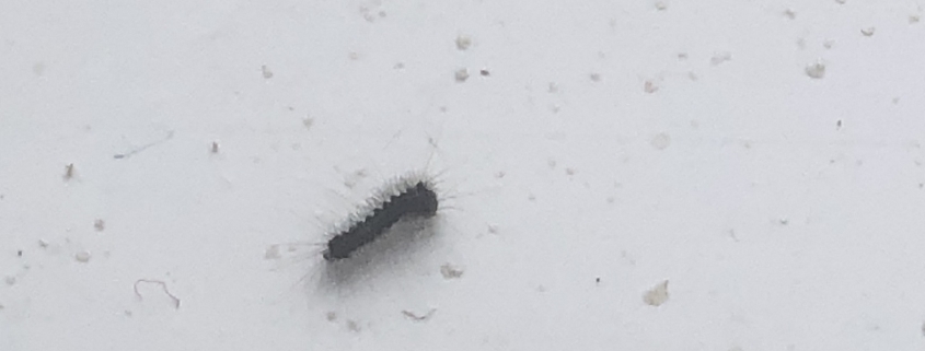 Number 7149. This appears to be a newly hatched caterpillar of a moth of some kind. When female moths find themselves trapped indoors, they sometimes will lay their eggs on a convenient surface; most often on or close to a ceiling. When the eggs hatch, the caterpillars will crawl about until they die of starvation.