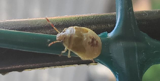 Number 6979. This is a nymph of a stink bug (Hemiptera/Heteroptera: Pentatomidae) that appears to have molted recently. It may be one of the predatory species in the genus Podisus (soldier bugs). Click here for an image & Click here for more information.
