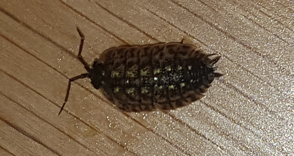 Number 6903. This is a sowbug, a terrestrial crustacean in the order Isopoda; the vast majority of these are harmless scavengers on decomposing organic matter. They breathe through gills that must be kept moist, so keeping your environs as dry as possible will discourage them from staying. Click here for more information.